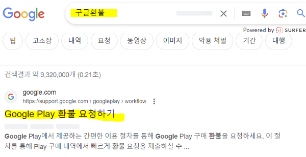구글 해킹 의심하고 구글창에 구글환불을 검색하고, 결제내역을 조회 후 환불요청을 합니다.
