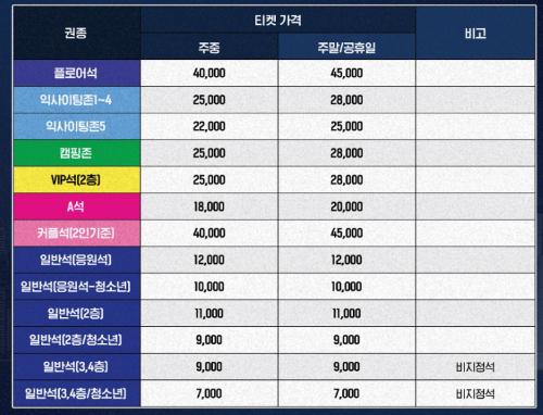 각 지역 구장별로 가격이 조금씩은 다르니 참고해보세요.