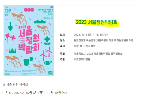 - 서울정원박람회 : 11월 15일까지 서울정원박람회가 함께 열립니다.