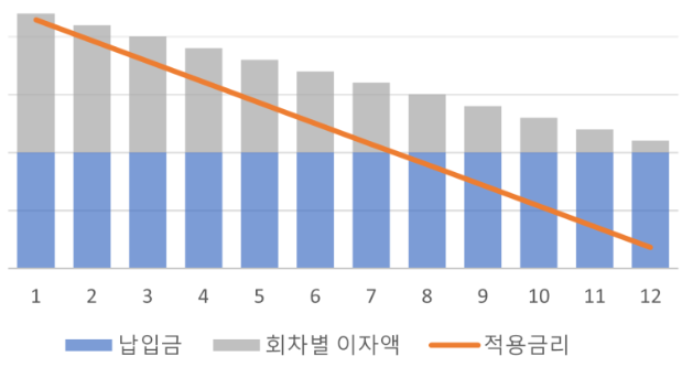 같은 금액을 적립하더라도 첫 회차에는 적용금리를 모두 적용받으나,