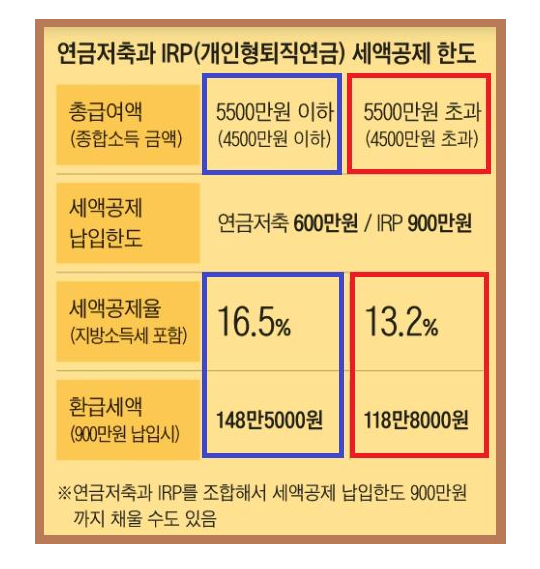 연금계좌 납입금 공제한도가 900만원까지 늘어난 부분을 확인하실 수 있습니다.