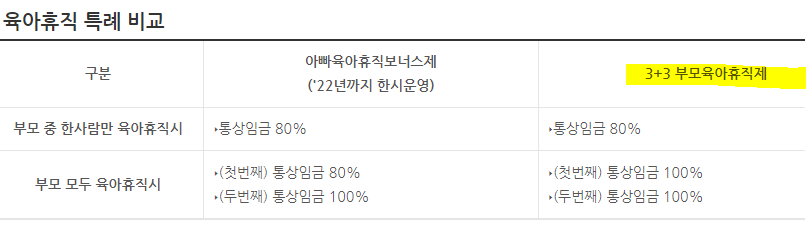 3+3 부모육아휴직제는 부모 중 한사람만 육아휴직 시 통상임금의 80%, 부모 모두 육아휴직 시 첫번째 통상임금 100%, 두번째 통상임금 100% 지급합니다.