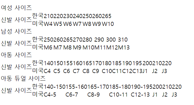 - 여성 210-W4 / 220-W5 / 230-W6 / 240-W7 / 250-W8 / 260-W9 / 265-W10