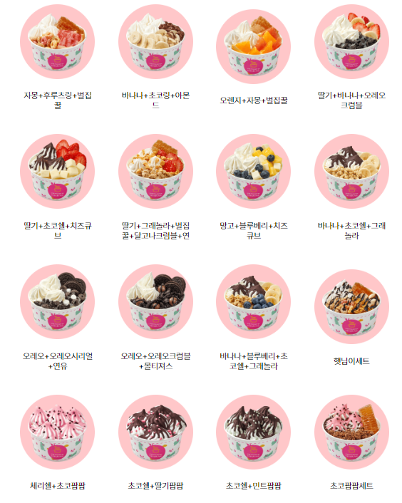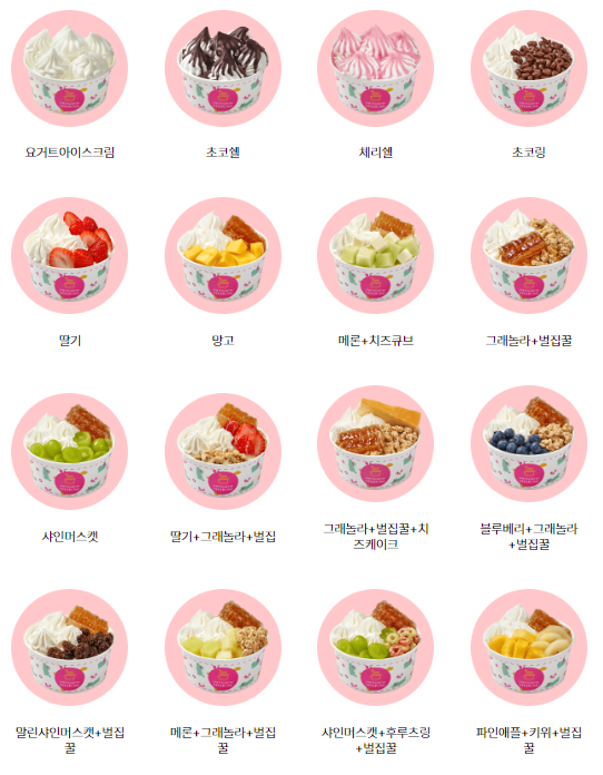 기본 베이스 요거트아이스크림 위에다가 토핑을 올리면 되는데, 우리 서브웨이 처음갔을때처럼 좀 어버버하게 되더라고요. 이것저것 어떤 조합이 요아정꿀조합인지 잘 모르겠다 싶으신 분들은 이미 만들어진 메뉴에서 고르는게 낫겠어요.