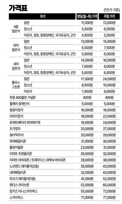 - 내야 일반석 평일 14,000원 주말 16,000원