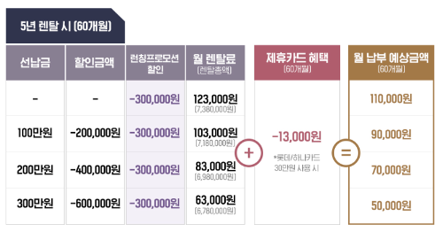 약정 기간 초기 비용 월별 할부금 연간 비용 이건 보통 세라젬마스터 안마기와 비교하면 될 것 같고요. 선납금에 따라 달라집니다.