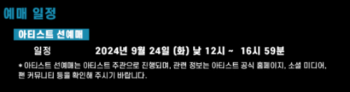 - 아티스트 선예매: 2024년 9월 24일 12:00 ~ 16:59
