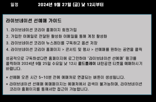 - 라이브네이션 선예매: 2024년 9월 25일 12:00 ~ 16:59