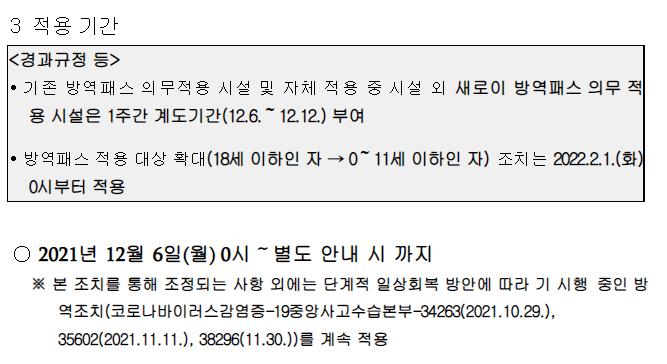또한 방역패스 적용대상이 18세 이하가 아닌 0세부터 11세 이하인 자로 변경하는 조치는 2022년 2월 1일부터 적용된다고 하니 참고하면 좋을 것 같습니다.
