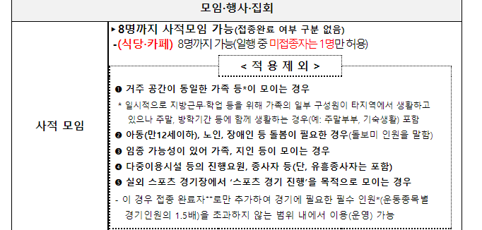 - 사적 모임은 8인까지 가능 (접종 완료 구분 없음)