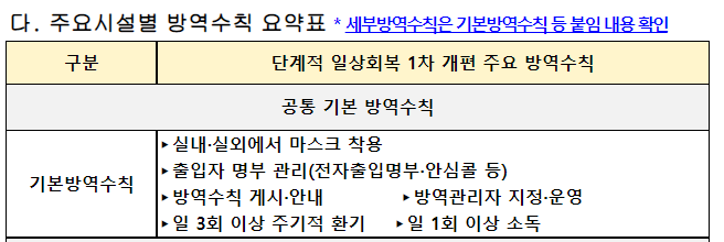 읽다 보니 밀집도가 제한 없다는 게 개인적으로 마음에 좀 걸리네요. 또한 유흥시설에서는 취식이 가능합니다.