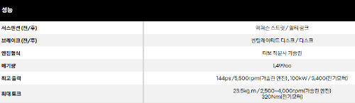 그랑콜레오스 성능 아래와 같습니다. 배기량 1,499CC 엔진형식 가솔린