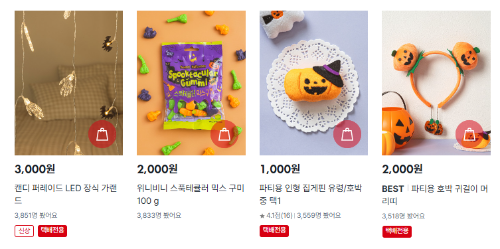 | 사탕바구니 (호박, 해골) | 약 1,000원~2,000원 | 아이들이 들고 다니기 쉬운 귀여운 디자인의 바구니 |