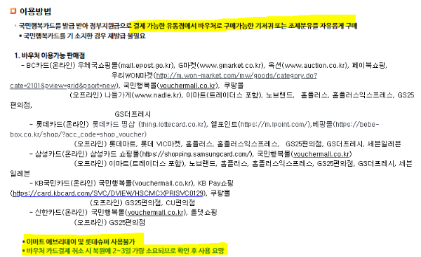 - 일부 매장에서는 바우처 사용이 제한된 제품이 있을 수 있어요. 예를 들어 기저귀와 분유에 한정된 바우처인 경우 다른 제품 구입은 불가능할 수 있습니다.
