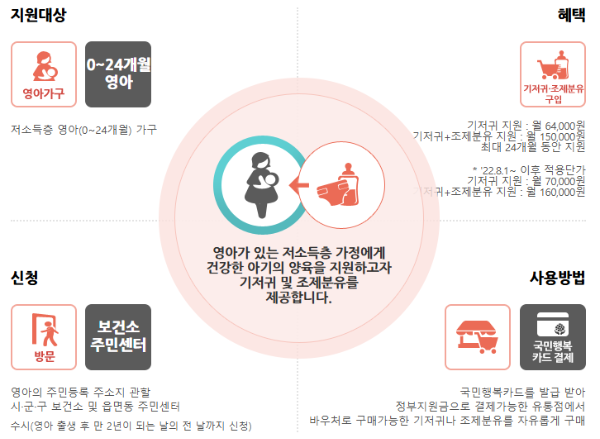 기저귀는 유아가 태어난 후 많은 비용이 발생하는 품목이라 지원이 큰 도움이 되는데요, 소득 기준과 자격 요건에 따라 기저귀와 분유 구입비를 함께 지원받을 수 있답니다.