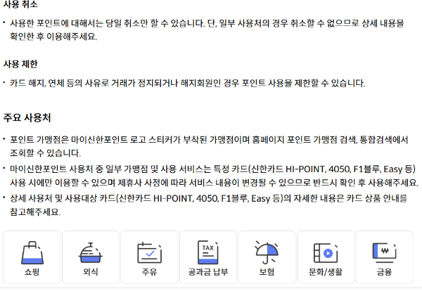 - 온라인 쇼핑: G마켓, 11번가, 쿠팡 등 주요 온라인 쇼핑몰에서 결제 시 마이신한포인트를 사용할 수 있습니다.
