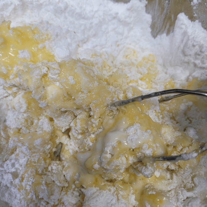 가루류는 한 데 체쳐모아두고, 액체류를 섞습니다. 그리고 실온 버터도 함께 넣어서 잘 저어주면 금세 되직해지고 반죽이 됩니다. 그때부터 손으로 치대면 되는데, 글루텐을 만들 필요는 없어서 너무 열심히 치대지 않아도 됩니다.