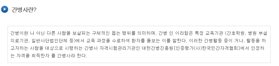 - 간병 업무를 겸할 수 있으나, 간호 중심의 역할.