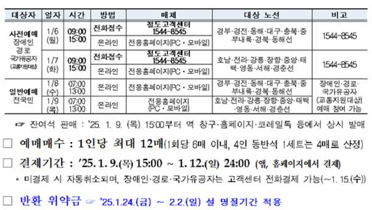 | 설승차권 예매 1/8일 오전 7시 | KTX 경부선 경전선 동해 대구 충북 중부내륙 경북 동해선 (2) | 2025.01.01 |