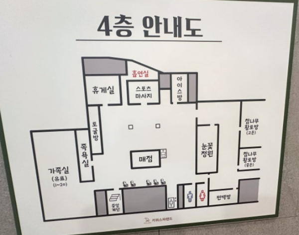각 층에는 키위스파랜드 가족룸이 마련되어 있어 프라이빗한 공간에서 휴식을 취할 수 있습니다. 가족룸은 3시간에 3,000원으로, 키오스크를 통해 예약이 가능합니다. 방 안에는 개별 TV가 설치되어 있어 유튜브나 넷플릭스 등 다양한 콘텐츠를 시청할 수 있습니다.