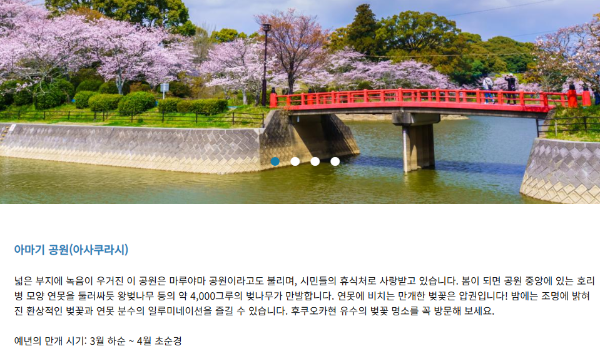 - 특징: 일본 벚꽃 명소 100선에 선정된 곳으로 약 1,300그루의 벚꽃이 심어져 있음