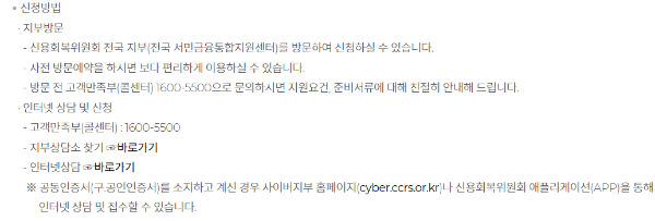 - 방문 신청: 서민금융통합지원센터 방문 후 상담 진행