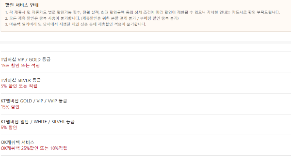 - KT: 멤버십 등급에 따라 10%에서 15%까지 할인 혜택이 제공됩니다.