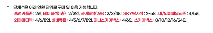 | 좌석 형태 | 테이블석 (6인) | 바베큐 테이블 (4인, 6인 선택 가능) |