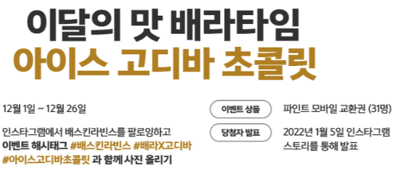 베스킨라빈스 이달의맛 이벤트 중에서는 배라타임 이벤트가 있습니다. 12월 26일까지 인스타그램에 #배스킨라빈스 #배라X고디바 #아이스고디바초콜릿 해시태그와 함께 사진을 올리면 파인트 교환권을 31명에게 증정한다고 합니다. 1월 5일 인스타 스토리를 통해 발표한다고 하니 이왕 먹을꺼면 재미있는 이벤트도 참여해보세요!