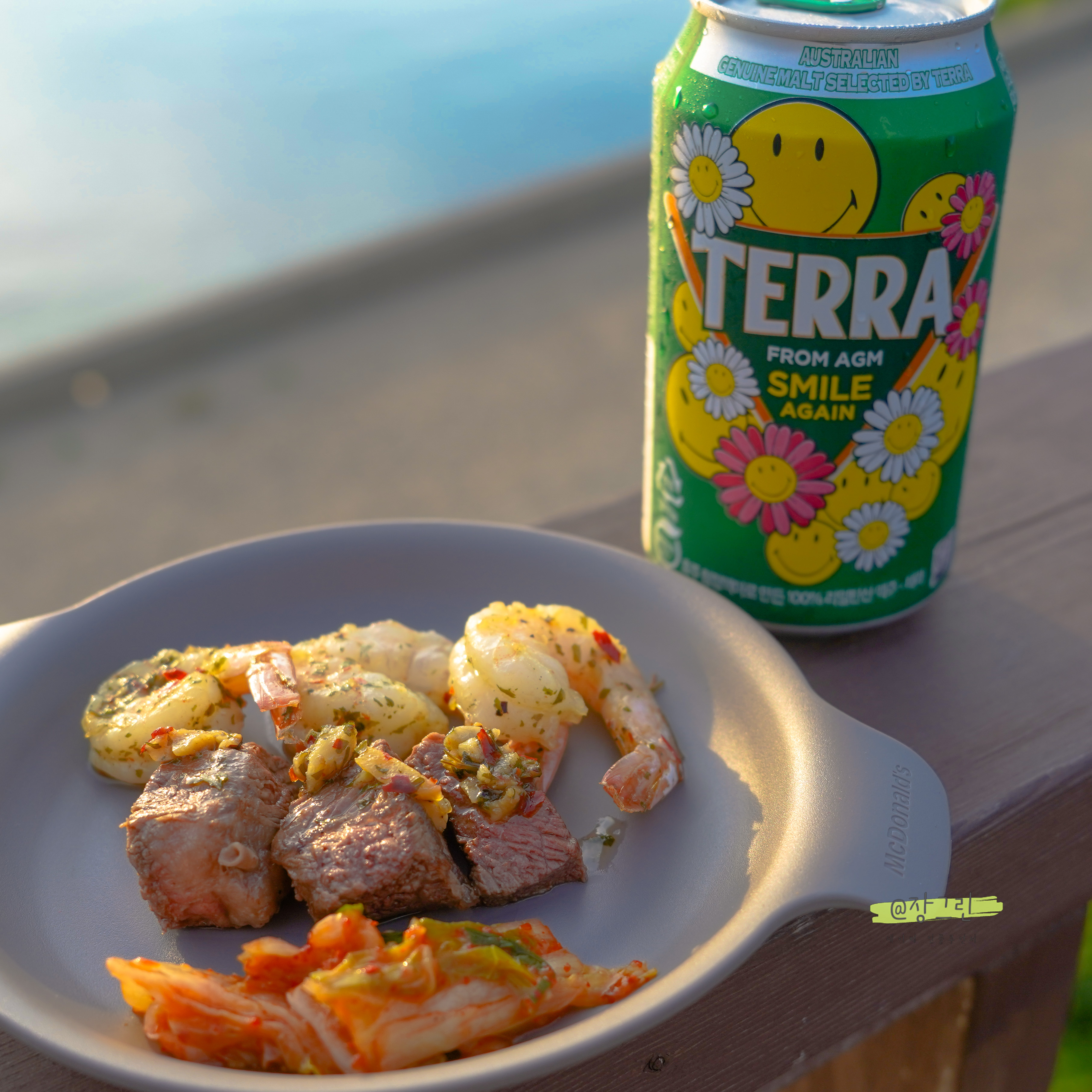 눈앞에 펼쳐지는 바다를 보면서 노래도 듣고, 맛있는 음식들도 만들어 먹었습니다. 저녁에는 쌀쌀할까 싶었는데 자기 딱 좋은 온도더라고요. 첫날에는 삼겹살을 해서 먹었으니 둘쨋날은 소고기를 준비하고 B급감성의 양식들을 준비해보았습니다.