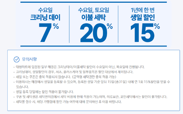 - 수요일 & 토요일: 이불 세탁 20% 할인