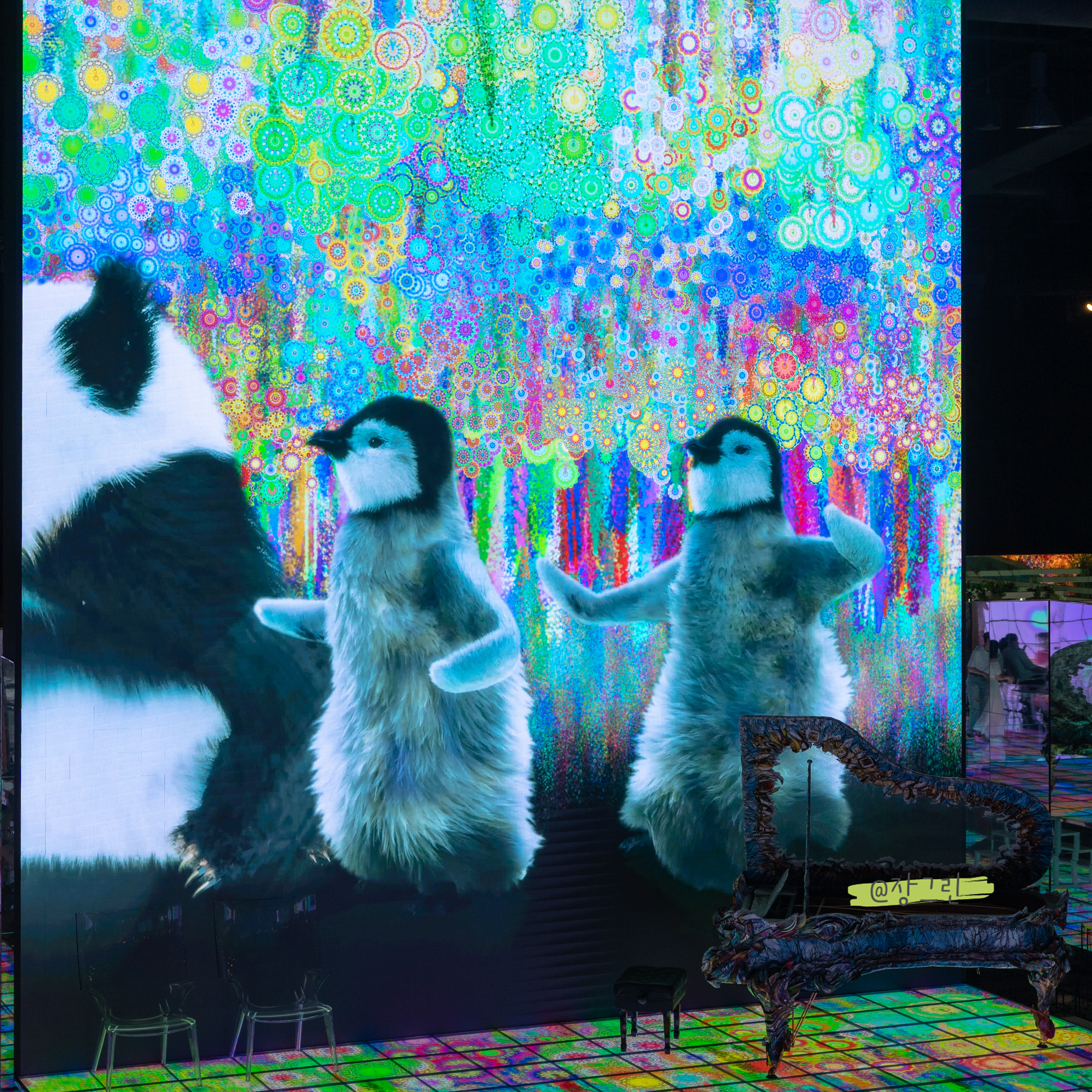 카페도 있고 테마도 있고, 볼거리도 많아서 눈이 풍성해지는 시간을 보냈어요. 약 1시간 30분 정도 부산전시 관람하는 시간을 가졌고요, 실내에서 정신없이 귀여운 펭귄과 곰돌이의 댄스타임도 감상하구요! 다채로운 색상으로 미디어아트를 하는데 무척이나 화려한 느낌이 들어요. 그리고 시시각각 변하는 테마안에서 내가 마치 작품의 일부분이 된 것처럼, 거울이나 공간을 통해서 꽉- 채우는듯한 느낌이 너무 신비롭고 좋더라고요.