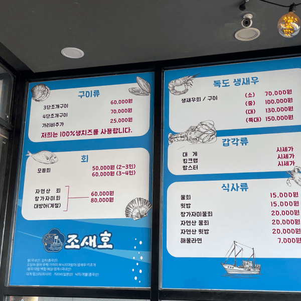 그리고 생새우회와 구이는 소 사이즈 70,000원 중사이즈 100,000원 대 130,000원 특대 150,000원으로 가격이 형성되어 있습니다.