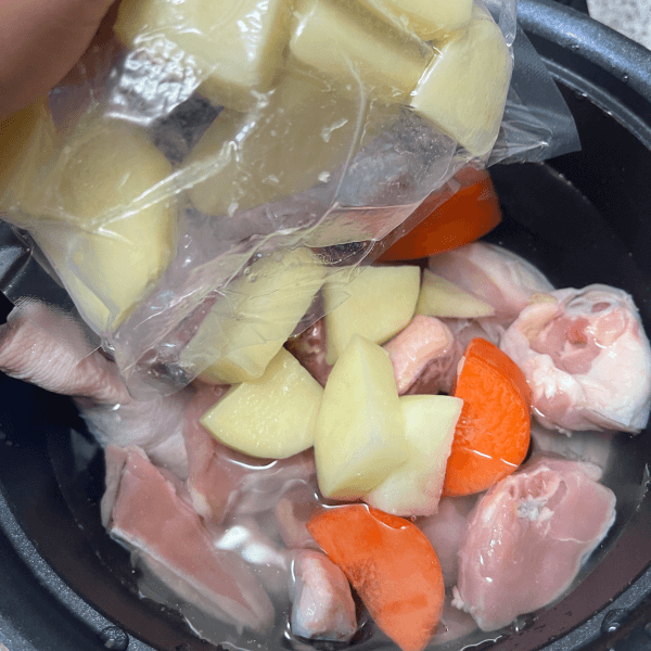 밀키트 안에는 이렇게 한 끼 만들기에 필요한 재료들이 전부 먹기좋은 크기로, 적당한 양이 손질되어 있습니다. 그저 준비할 것은 물 750ml, 그리고 살짝 물에 재료를 헹궈주는 것뿐이랍니다. 냄비에 물과 씻은 닭을 넣고 감자, 당근을 넣고 강불로 끓여주었습니다.