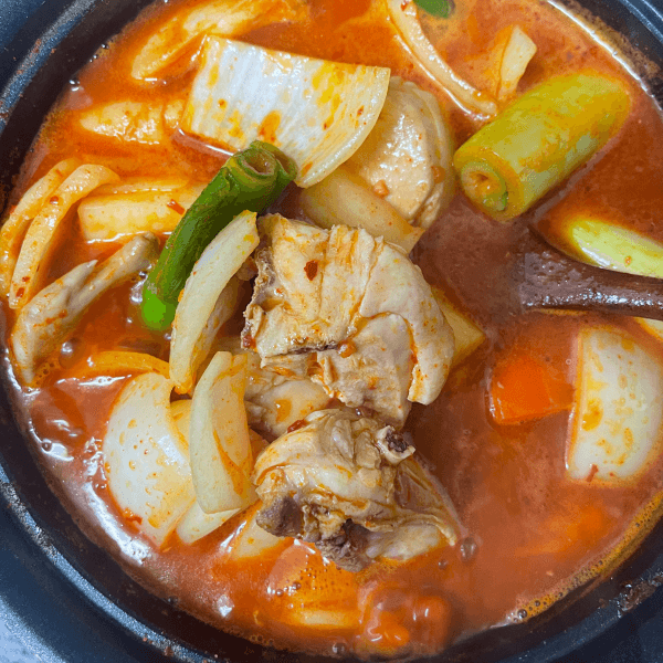 닭을 넣은 물이 끓으면 빨간 양념소스 넣어주고 대파랑 양파도 넣어주고, 물떡 감자수제비까지 낭랑하게 넣고 끓여줍니다. 총 만드는 데는 약 20분 정도 소요되었습니다.