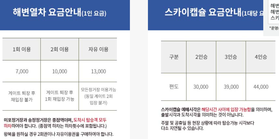 - 해변열차 요금은 1회 7,000원 2회 10,000원 자유이용 13,000원