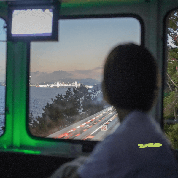 맞은편에서 다가오는 스카이 캡슐과 서로 마주하게 되는데 정말 이국적인 분위기를 자아내더라고요. 여기가 부산이 맞나? 저 멀리 광안대교, 그리고 손톱만 한 달, 고층 아파트들의 불빛이 아주 멋지게 보입니다. 좋아하는 노래를 틀어두고 멍하니 바깥을 바라보니 그저 감탄만 나오더라고요. '와 여기서 프러포즈하면 진짜 기분 좋겠다!'