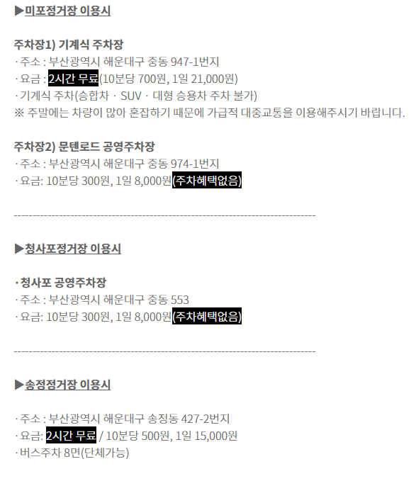 블루라인파크 이용하는 고객을 위한 주차장 지원은 미포 주차장, 송정 주차장 2시간 무료 지원입니다. 청사포 공영주차장은 주차 지원이 되지 않고 10분당 300원의 요금을 부과합니다. 해운대 주차 가격이 만만치 않으니 시설을 이용할 계획이시라면 무료주차 혜택을 누리시길 바랍니다.