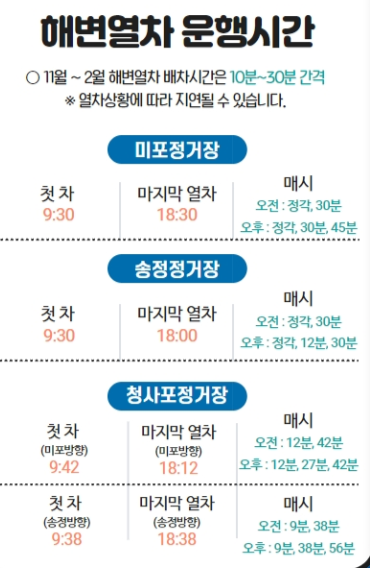 해운대 해변열차는 11월~2월 기준으로 10분에서 30분 간격으로 운행합니다. 미포 정거장, 청사포 정거장, 송정 정거장 각 정거장마다 첫차 및 막차시간을 미리 알아두시면 좋겠습니다.