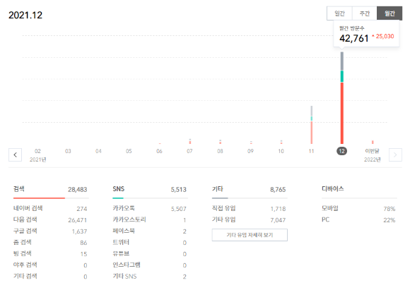 2021년 12월도 이제 가고 2022년 새해가 돌아왔네요. 먼저 새해 복 많이 받으세요! 티스토리는 2021년 11월부터 운영해오고 있습니다. 티스토리 2달 차인 12월은 11월보다는 더 잘해보자 라는 생각으로 블로그 글을 더 열심히 써보자 다짐했습니다. 이번 달 다음 블로그 티스토리 통계를 참고해서 12월 기록을 해볼까 합니다.