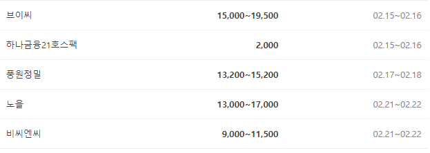 2022년 2월 공모주는 IBKS제17호스팩, 바이오에프디엔씨, 한국제10호스팩, 퓨런티어, 스톤브릿지벤처스, 브이씨, 하나금융21호스팩, 풍원정밀, 노을, 비씨엔씨로 총 10개의 공모주가 있습니다. 사실상 현대엔지니어링이 가장 2월 일정 중 가장 대어급이라고 볼 수 있었는데요. LG에너지솔루션으로 이번에 자금이 몰리는걸 직접 겪으면서 불확실한 시장에서 신규상장 공모주의 인기를 다시한번 실감했습니다.
