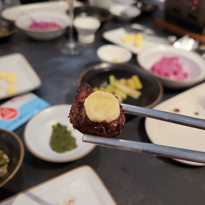 그리고 같이 내어주신 라꽁비에뜨 버터와 한우의 조합, 새로 알게 되었는데 다음에 집에서 고기 구워먹을 때 꼭 버터랑 곁들이려고요. 작게 조각내서 함께 한우를 즐겨도 맛있게 먹을 수 있는 조합인 것 같아요! 광안리 우토피아에서 소고기 맛있게 먹는 법 잘 배워갑니다~