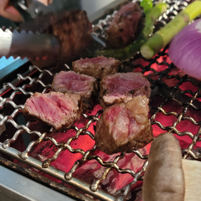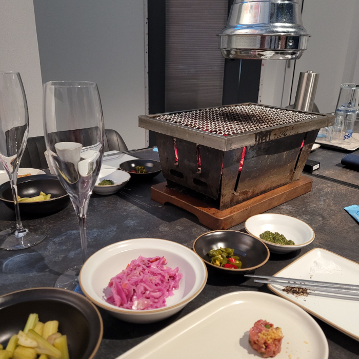 어쨌든.. 자리는 좀 아쉬웠지만 그만큼 우리만 있는거에 의의를 두고. 화로에 불을 올려주셨습니다. 저희가 뭘 시켰는지 기억은 잘 안나는데 대략 세트메뉴였던 것 같아요. 안심 등심 살치살 거미살 등등!