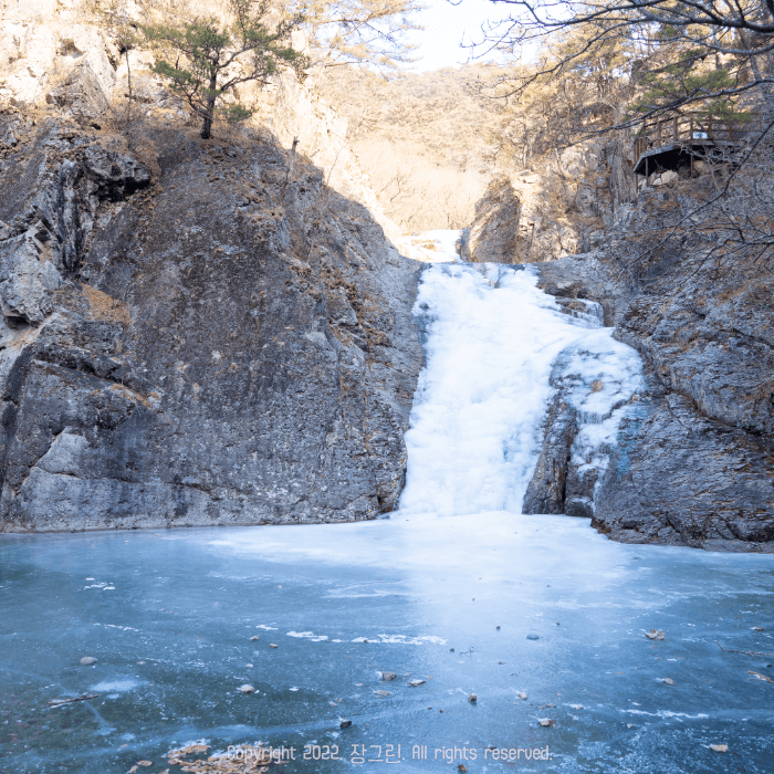 여기서 만족하긴 아쉽습니다! 조금 더 걷고 걸어 저희의 목표 용연 폭포까지 걸어가야죠. 여름이면 콸콸- 흐르는 물소리를 들었을 텐데 정말 날씨가 추워서인지 꽁꽁 얼어있더라고요. 부산 사는 저는 잘 못 보는 광경이어서 신기했습니다. 주왕산의 폭포 중 가장 크고 웅장한 규모를 자랑하는 용연 폭포입니다. 하천의 침식작용으로 생겨난 하식동굴이라더라고요.