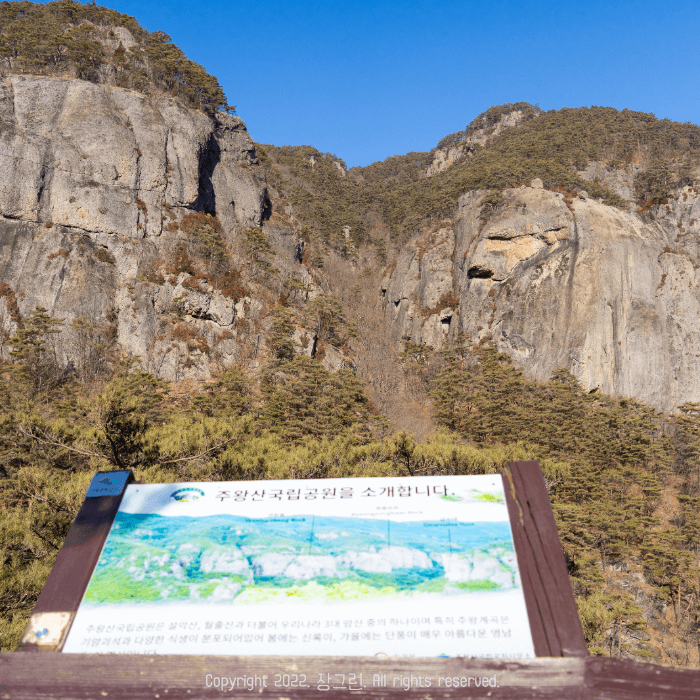 내려오는 길에는 우리가 걸어 올라왔던 아랫길 말고 윗길로 올라가 보기로 합니다. 급수대 쪽에서 작은 샛길이 있는데요 주왕암, 주왕굴 가는 방향으로 표지하고 있습니다. 이곳에서는 보다 높은 곳에서 주왕산 국립공원을 소개하는 푯말을 볼 수 있습니다. 바람이 많이 불고 추웠지만 멋진 장관이 펼쳐지더라고요. 길은 좁고, 낙석주의 표지판이 계속 붙어있었지만 이 길로 내려오길 잘했다는 생각이 들었습니다.