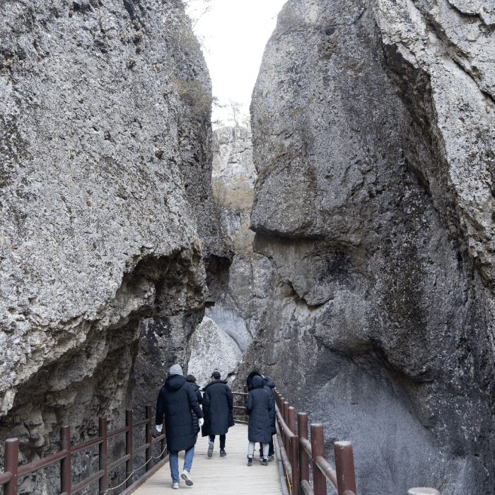 학소대를 지나 용추 협곡을 마주했습니다. 암석이 양쪽으로 웅장하게 있더라고요, 처음 보는 신기한 광경이고 사진도 많이 찍는 스폿을 실제로 보니 또 신기했습니다. 너무 추워서 보이는 물들이 다 얼어있더라고요. 용추란 용이 하늘로 승천한 웅덩이를 뜻하고, 협곡은 급경사를 이루며 암석이 양쪽으로 높이 서 있는 골짜기를 뜻합니다.