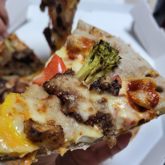 좋아하는건 다 갖다 넣었네요. 그런데 브로콜리, 이 녀석 생각보다 존재감이 있습니다. 뭔가 구워서 그런가 달달해진 맛이 있는데 피자 먹는데 조금 저는 거슬리더라고요. 고기도 보통? 아! 그리고 2천원 추가한 곡물도우는 꽤 괜찮았습니다. 나폴리로만 먹다가 너무 얇다고 느껴져서 피자를 먹는 맛이 안나길래 요즘은 곡물도우로 꼭 추가해 먹습니다.
