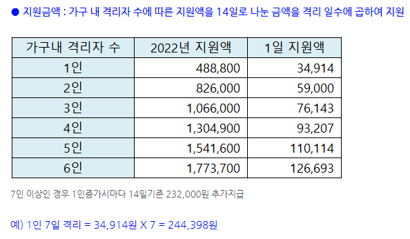 코로나 생활지원비는 실제 입원하거나 격리한 가족 수에 맞게 금액을 계산해야 합니다. 가족 중 1명이 코로나에 감염되었다면 1명 분만 신청해야 하는 것입니다. 재택 치료자에게도 추가 지원금이 있었으나 이는 현재는 폐지되었습니다. 기타 문의는 129번, 보건복지상담센터 및 시군구청에 전화로 문의해도 됩니다.