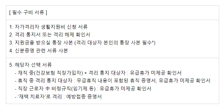코로나 확진자 지원금, 즉 생활지원비를 신청 가능한 사람은 격리 통지서를 받은 사람이 됩니다. 격리 통지서는 문자 혹은 SNS로 통보가 됩니다. 신청은 관할 읍, 면, 동에 할 수 있고 격리해제일 이후부터 3개월 이내에 코로나 확진자 지원금(생활지원비)을 신청하면 됩니다. 코로나 지원금 신청할 때 필요한 서류는 생활지원비 신청서(현장), 통장사본, 신분증, 자가격리 통지서가 필요합니다.