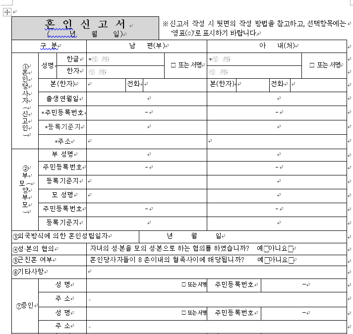 - 정확하게 모르겠으면 공란으로 둔 채 혼인신고를 할 때 담당자에게 물어보면 가장 정확합니다.